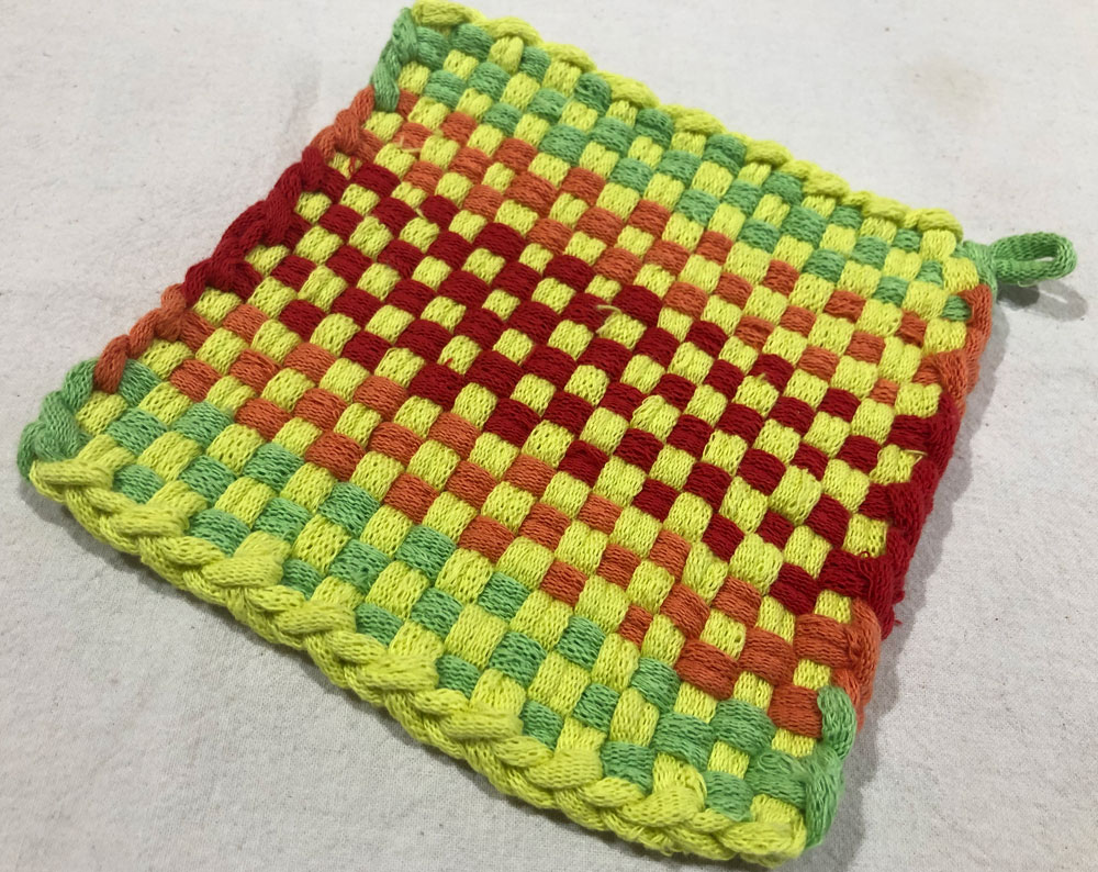 Carie created this charming pot holder on a trip with her husband. Pot holder looms are a lot easier to use while traveling.