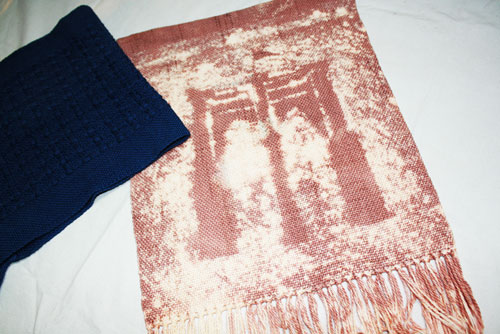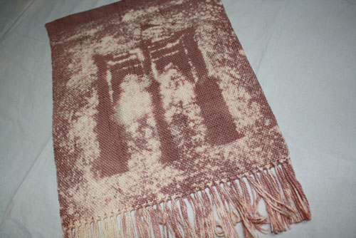 Katy did a reverse of dyeing. She stenciled a solid color and removed (bleached!) the areas not covered. A view of the Brooklyn Bridge is the landscape.