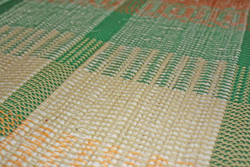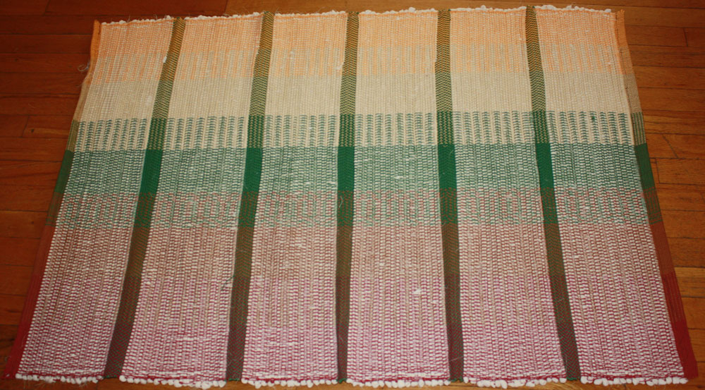 Its a rag rug that has plain weave picks alternating with Twill.