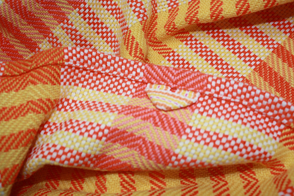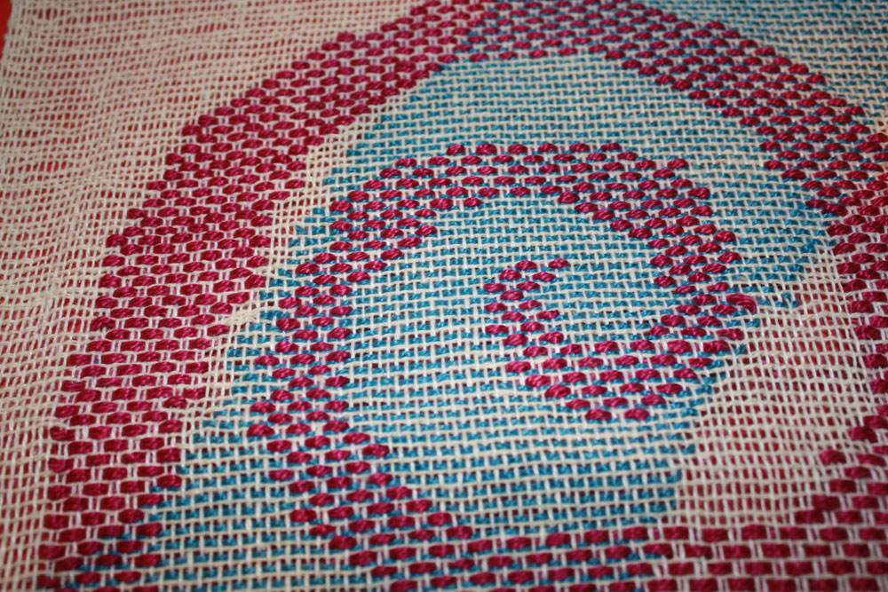 This looks realy tricky to do. You are working with the yarn for the ground weft as well as two other colors for pattern. Great results.