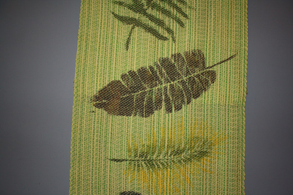 Terry showed this wall hanging. The tropical leaves were stecilled on the warp before weaving.