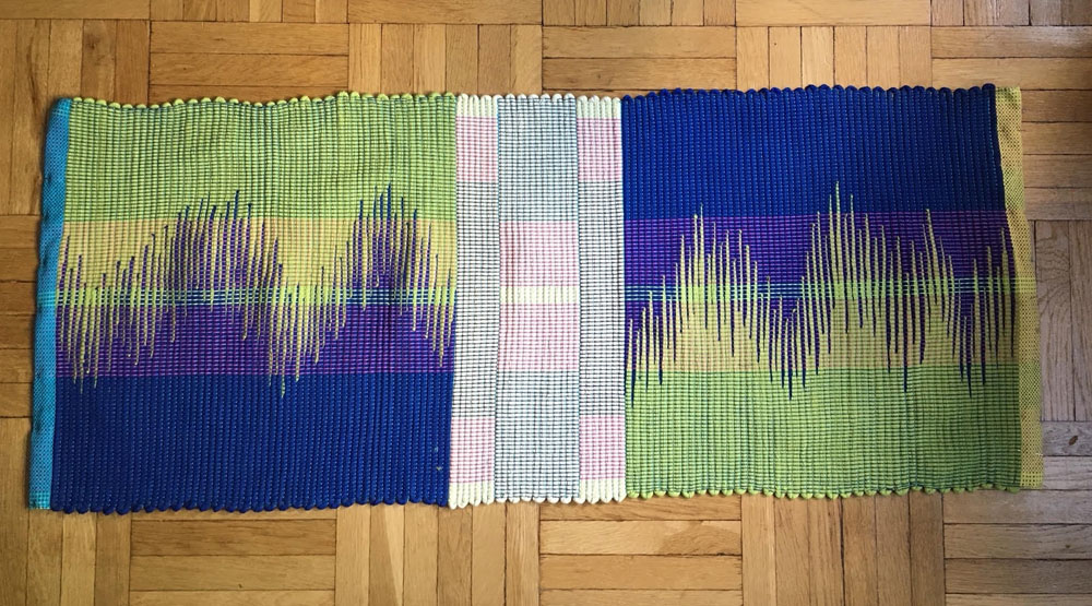 Thomas contined his exploration of double weave. In addition to finding how to weave twill on one of the layers, he did this wonderful symbol in pick up. Wow!