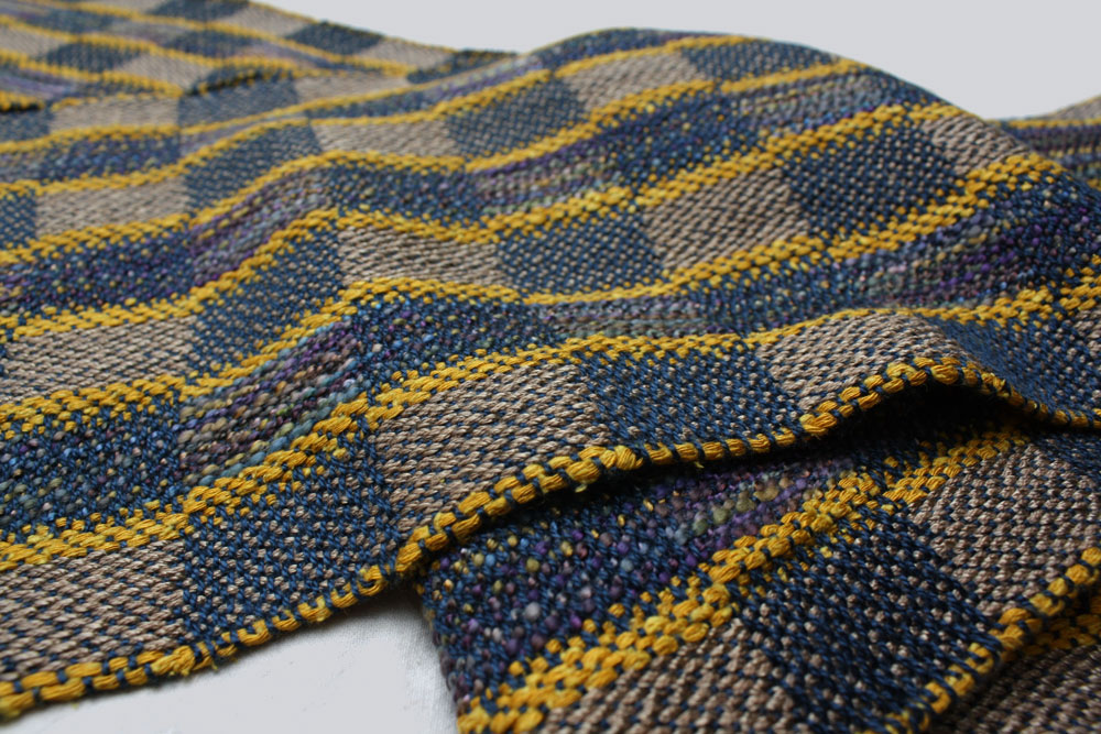 Terry has been looking for a use for his hand spun and this is it. The warp is commercial bamboo. The hand spun is pre dyed fleece of blue faced Leiscter sheep.