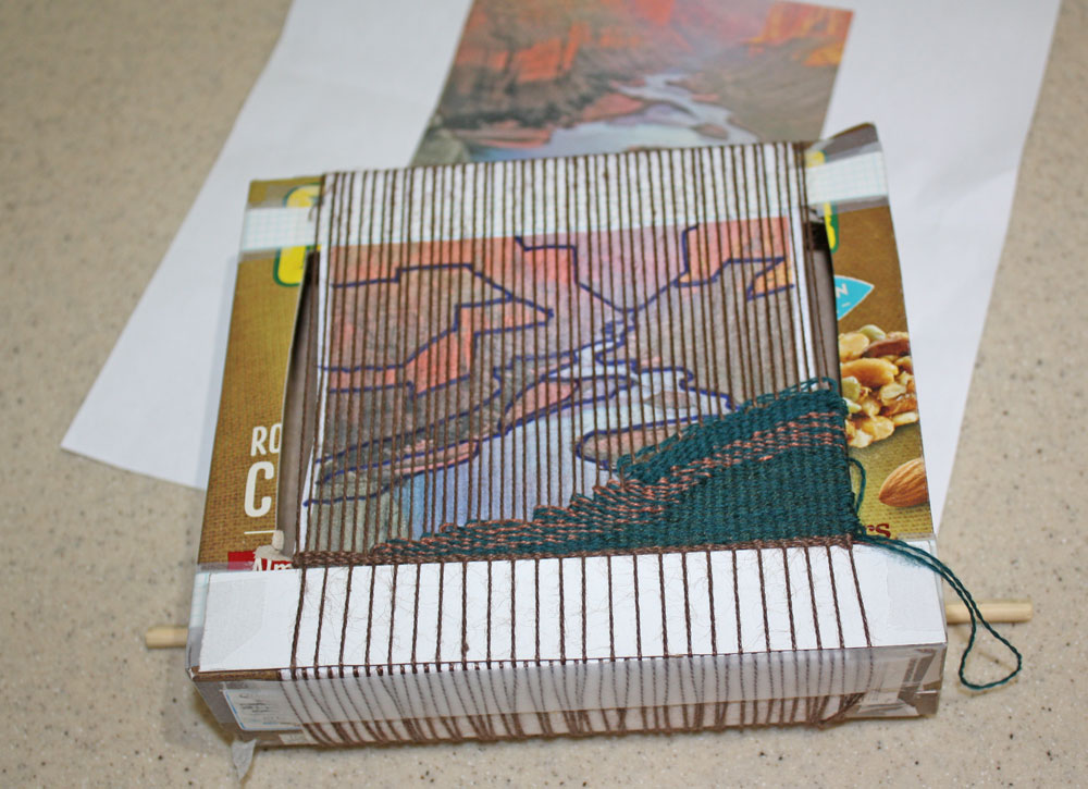 Carie tackled tapestry by using a box as the loom for her piece. She said that tapestry is not for her but it certainly looks good here.