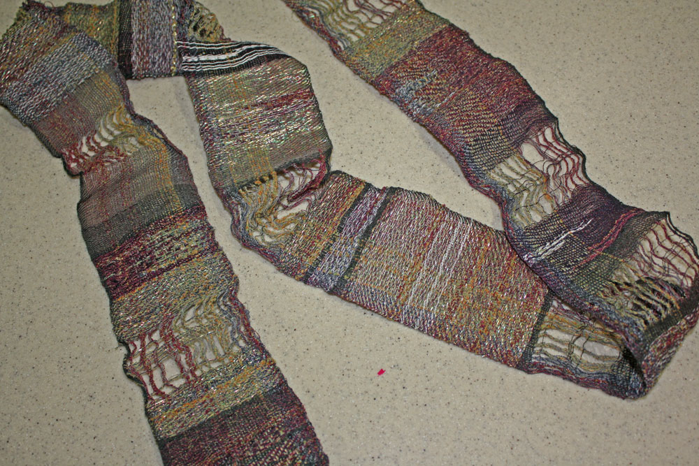 She used all kinds of out of the box (normal?) yarn to weave this piece. Also note the leno between the solid woven parts.
