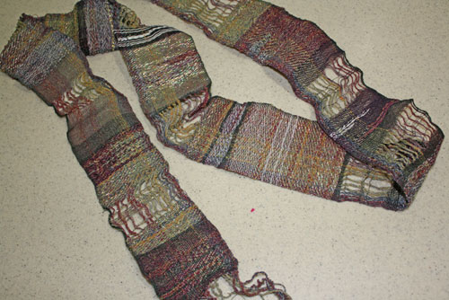 Leila steppped away a little from her scarves. This narrow band had all sorts of wonderful things goin on. We couldn't decide if it should be made into jewelry or act as a wall hanging. In either case it is splendid.