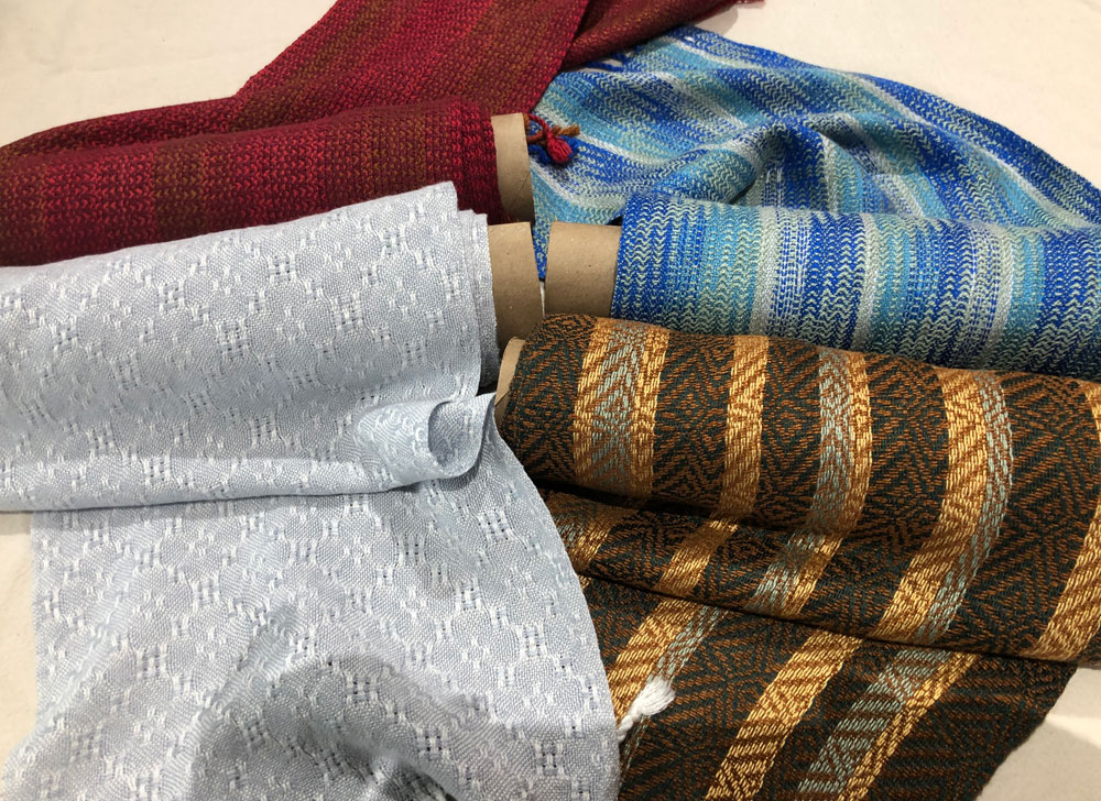 Four scarves woven 100% in a new fiber to him. Bamboo! It has super drape and is very light weight. A possible substitute for more expensive silk.