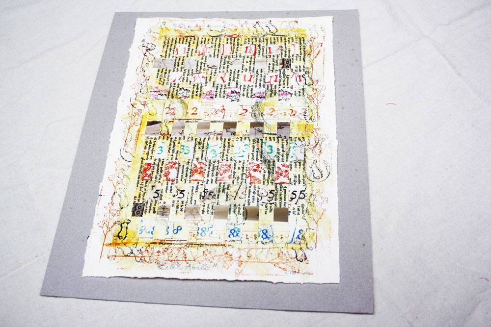 Claudia worked this great art piece in her own hand made paper. The text is from Fibonacci's "Liber Abaci" which dealt with calculatiion.