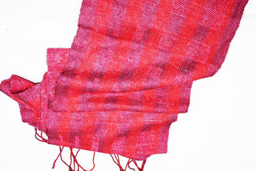 Warp is a fine bamboo yarn and the weft is his handspun merino wool.