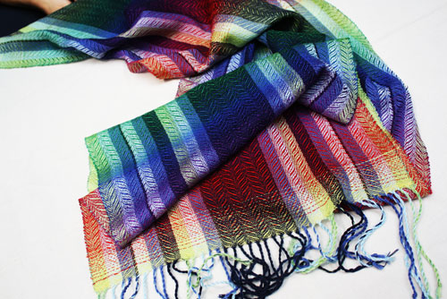 Fibonacci sequence is in the weft patterns. This was done in lushious cashmir and silk. We couldn't keep our hand off of it..