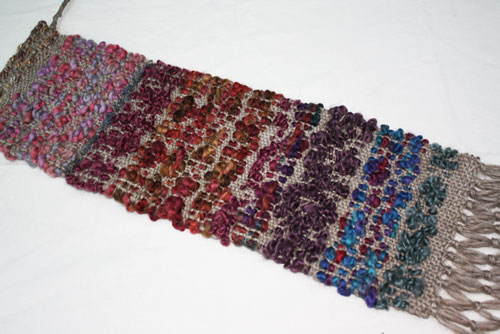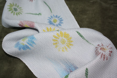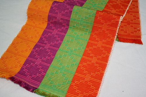 Terry did this small runner with a painted warp. That is the warp threads are painted before being woven.