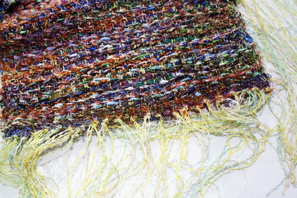Carol had an interuption in the weft of this beautiful scarf. She created a slit to let the free end pass through. Clever!
