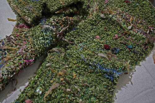 The warp was painted before it was woven. Real leaves formed the pattern for stenciling.