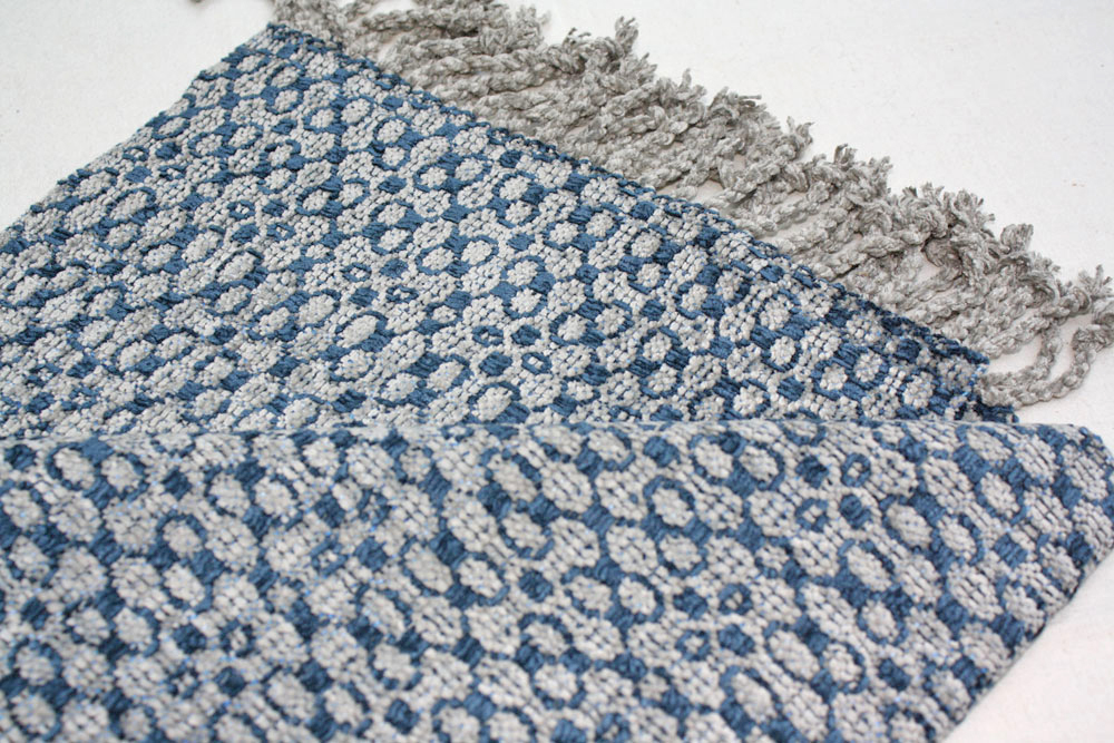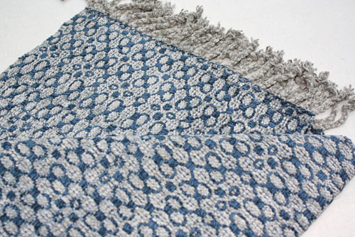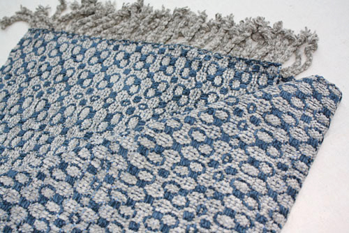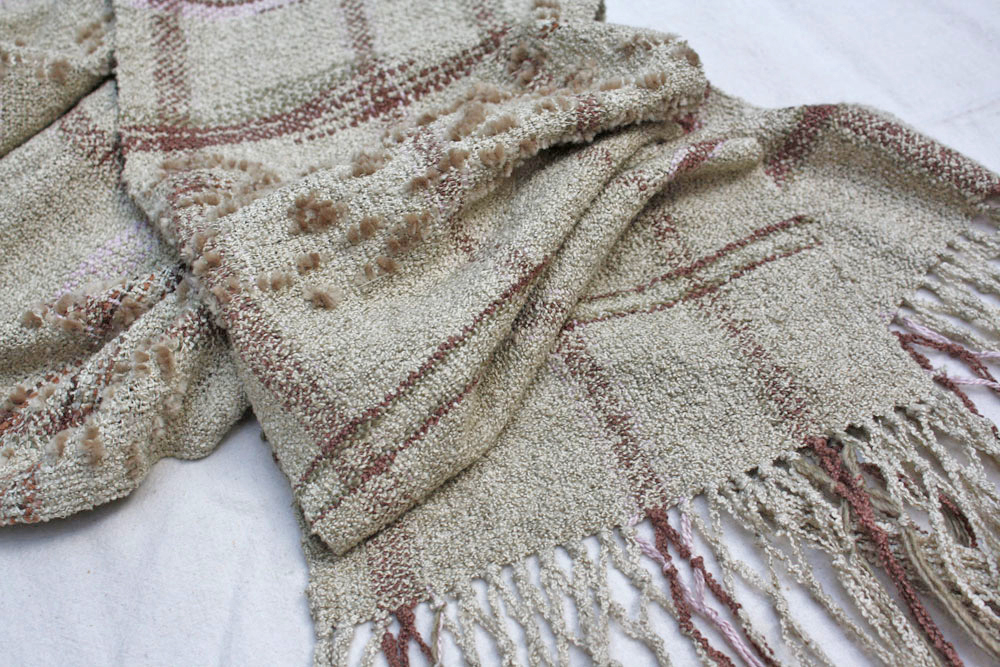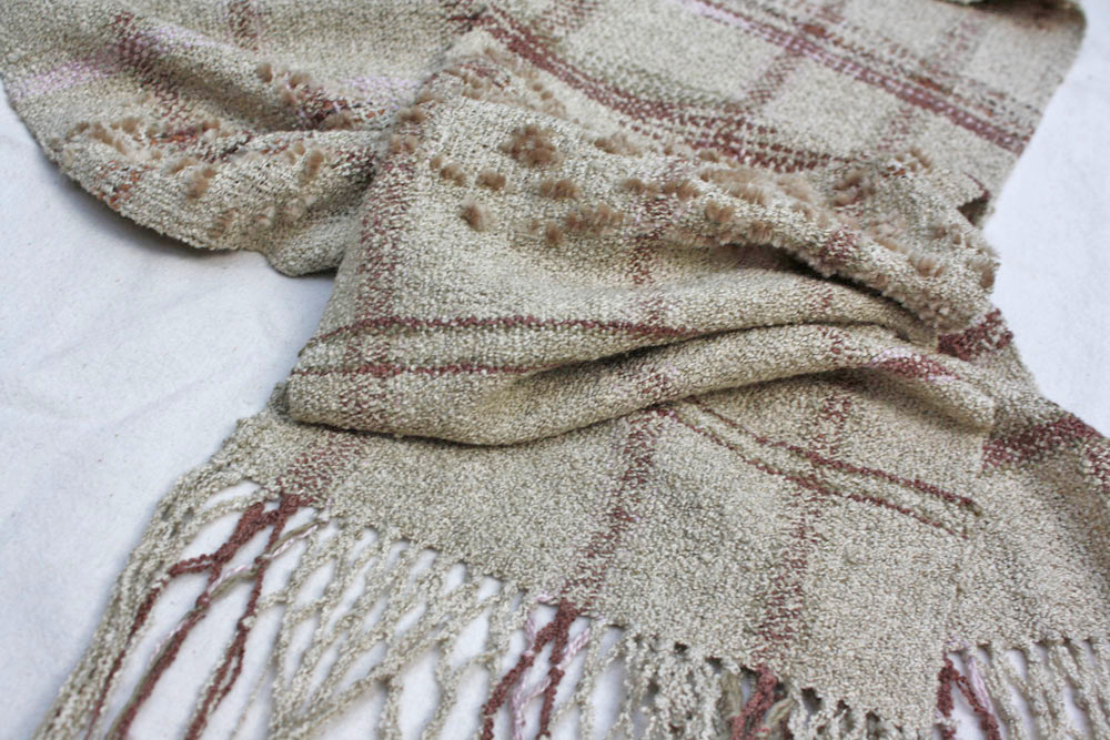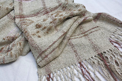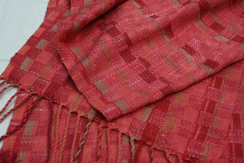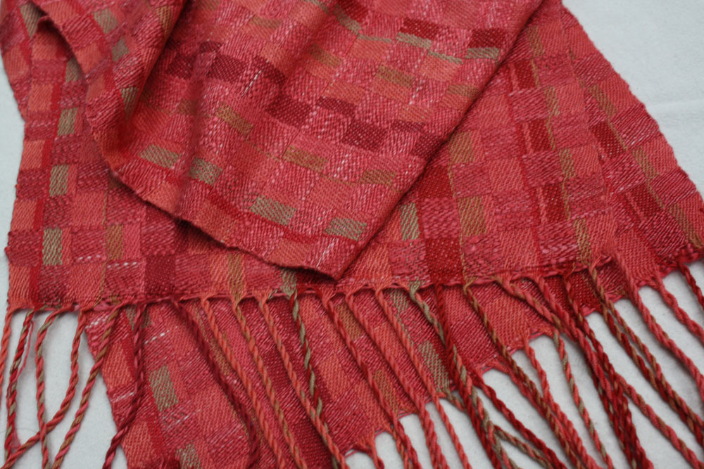 Commmercial silk was the warp. Not so great dyeing of the weft gives this piece a little life.