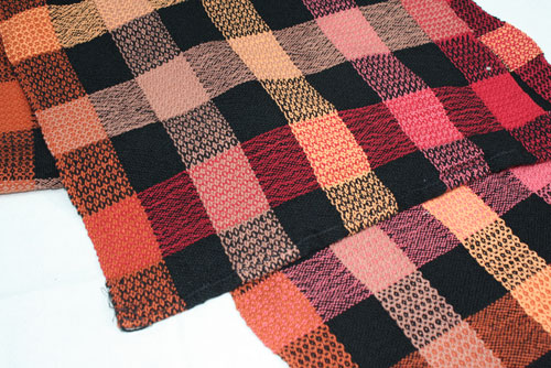 Carie got the lumpy and bumpy by mixing different weights of yarn in the warp. Some really beautiful colors here.