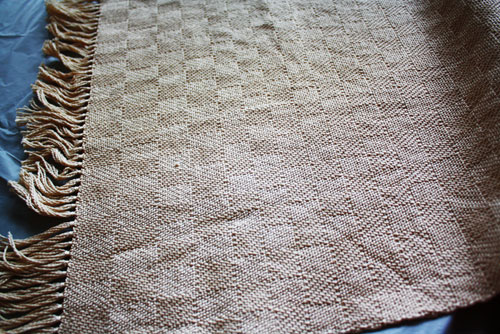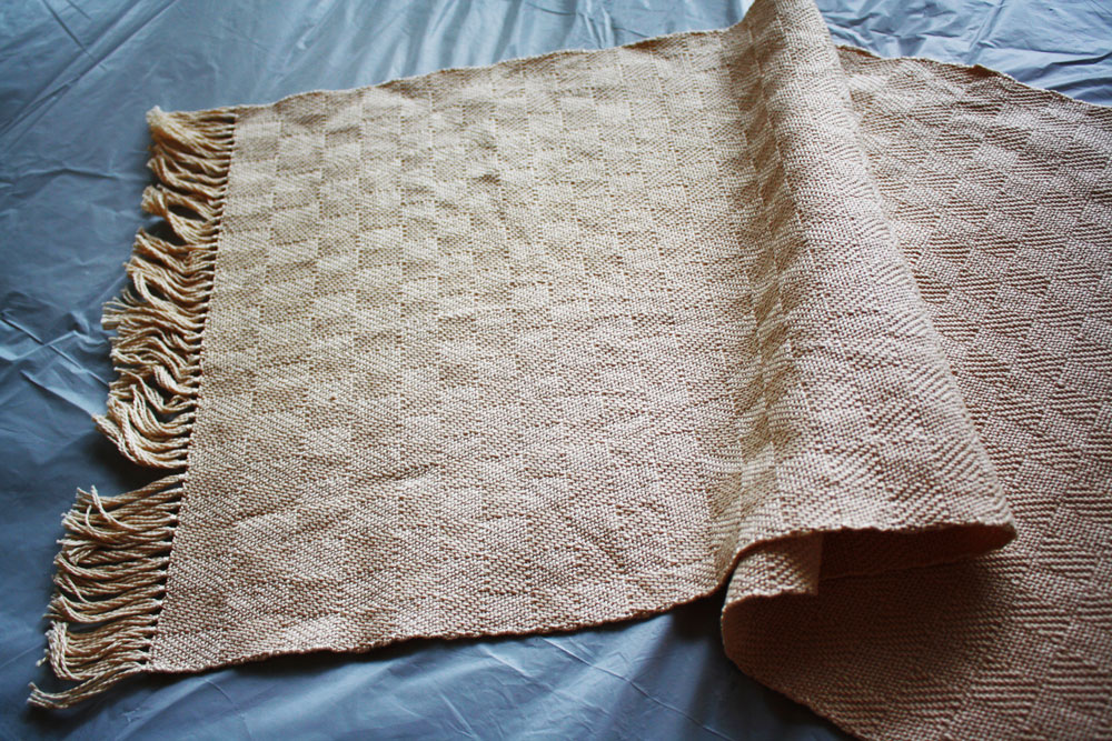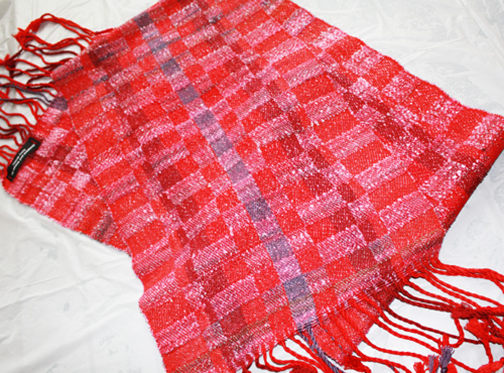 Terry's favorite color is red. So, of course, the warp would be in those colors. Weft is a paler shade is his handspun.