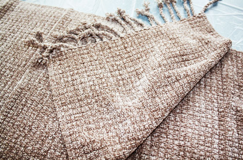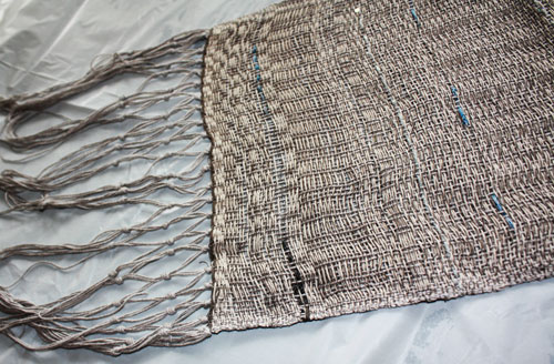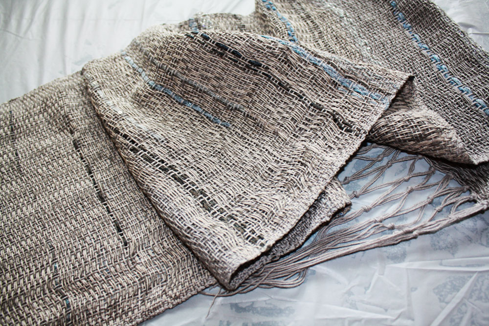 Warp is bamboo and silk. The weft is wool and tencel.