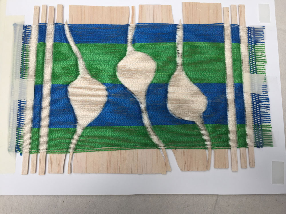 The answer can be seen when she lifts up the framing mat. That's balsa wood she used for weft. What a gem!