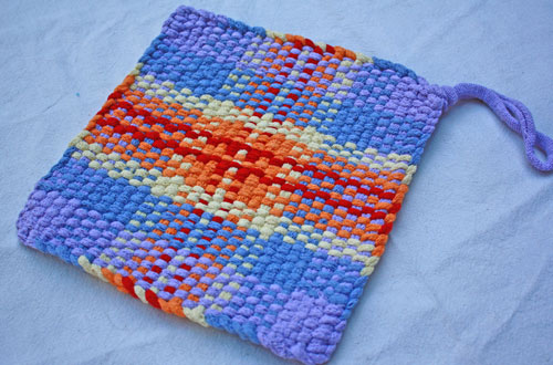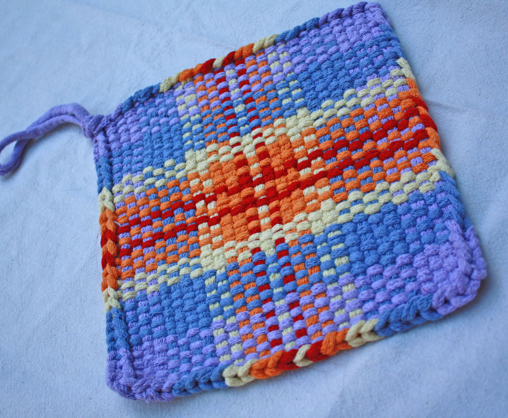 Darby has been away from her big loom during the pandemic but she was able to create this giddy potholder on her pin loom.