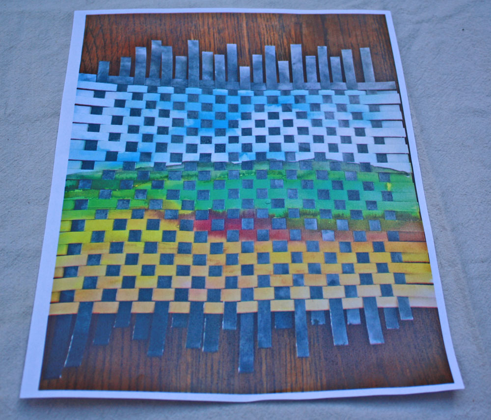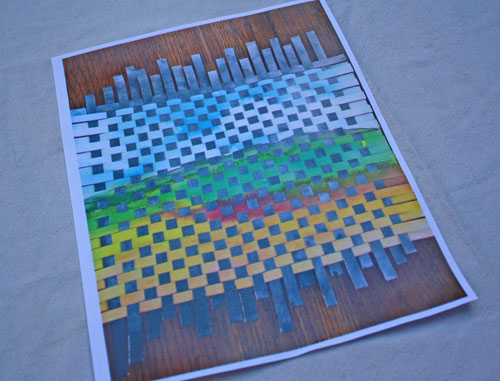 Judy worked in two of her current watercolors into this plain weave piece. One was of her favorite mountain scene and the other her impression of smoke.