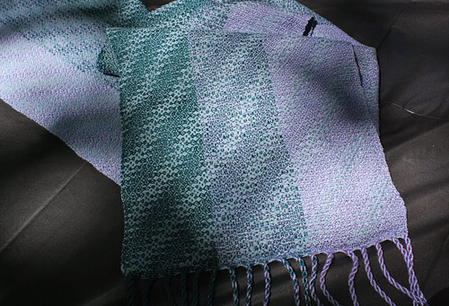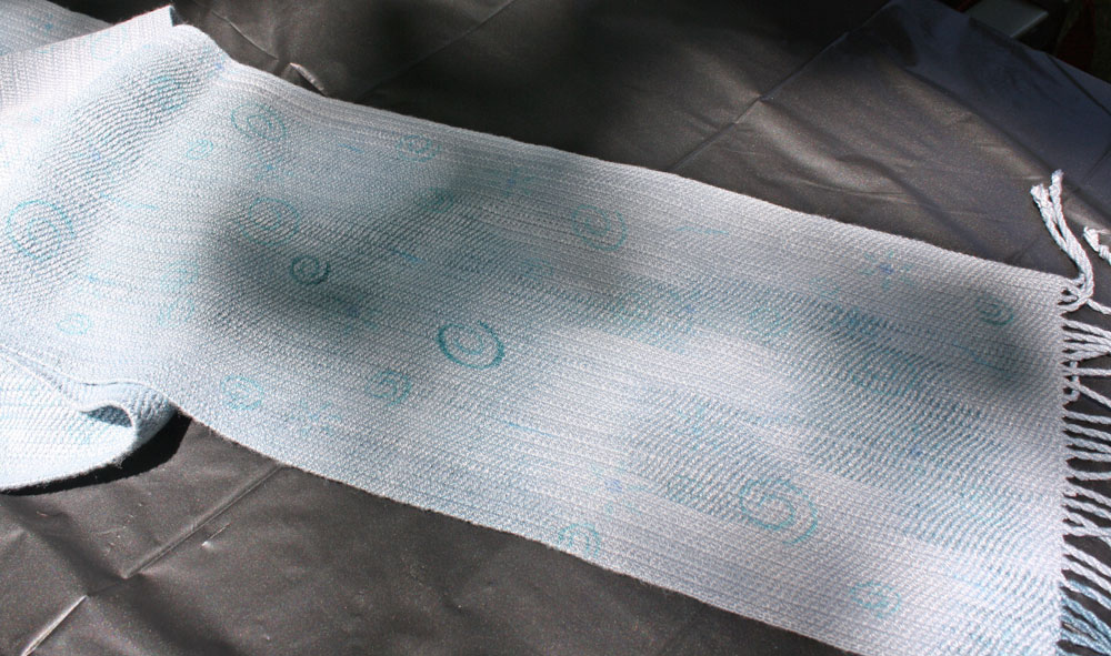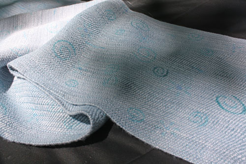 So she very cleverly stencilled some designs on the finished scarf. Love the spirals.