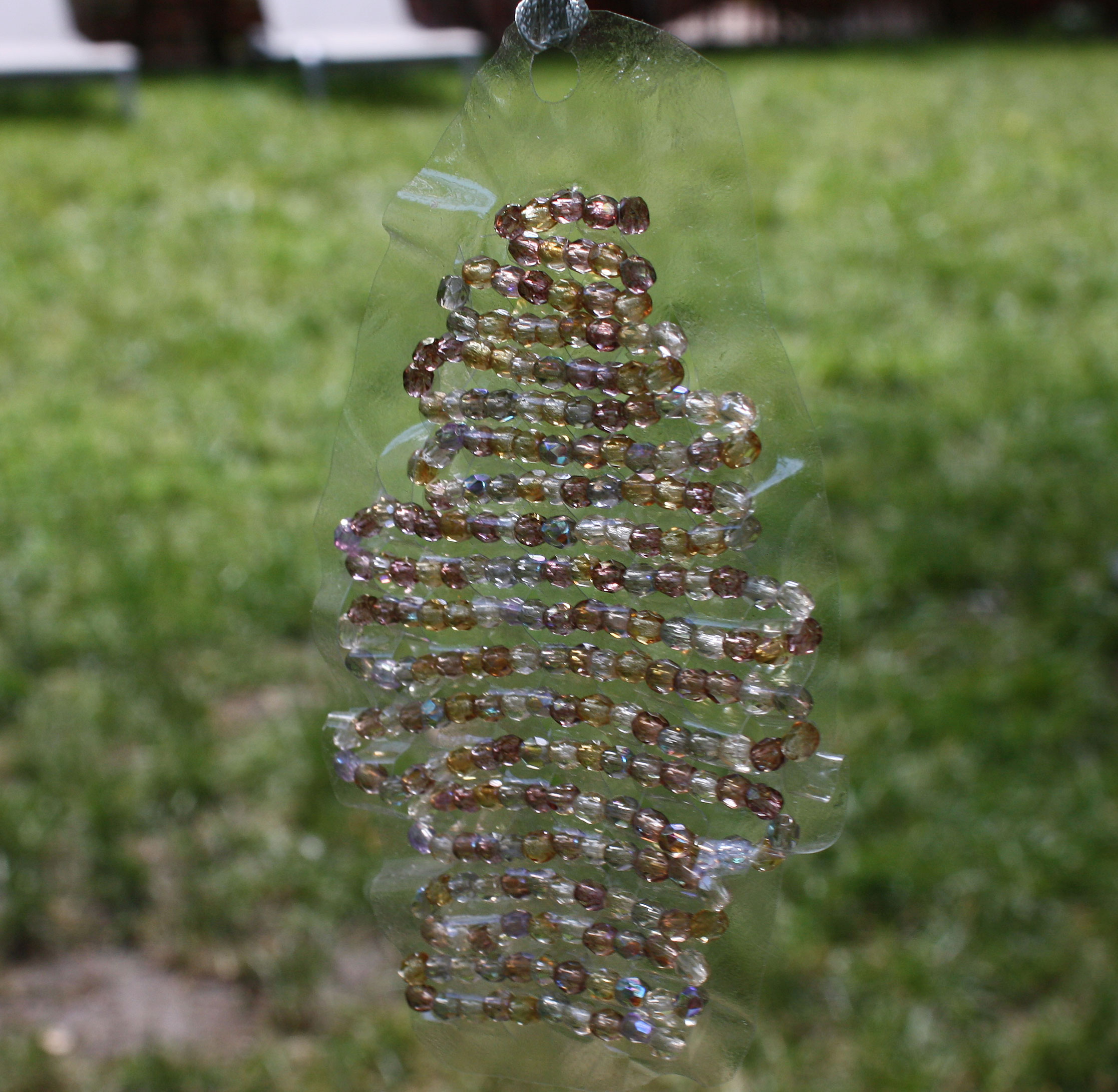 Claudia created this charming piece. Beads woven in the plastic. It works as a pendant on a necklace.