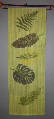 Terry showed this wall hanging. The tropical leaves were stecilled on the warp before weaving.