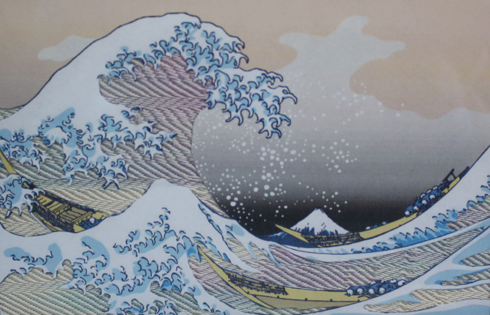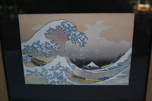 Claudia very carefully cut out all the dark blue part of the famous Hokusai print "The Great Wave" and place her woven piece behind.