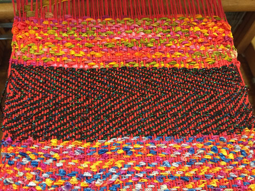 After plain weave and 2/2/twill we showed how to do what we called "pattern weaving". This was really a unique lifting sequence. The students seemed to like this a lot especially as we started introducing a wider variety of yarn.